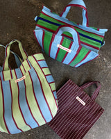 Durable and eco-friendly, our everyday Bengali Bags are made from 100% Recycled Nylon in assorted coloured stripes, perfect for everyday use and features and zipper enclosure. Reusable and a super strong 'carry all' perfect for shopping, beach and everyday living.