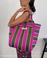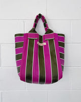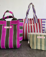 Durable and eco-friendly, our everyday Shoulder Style Bengali Bags are made from 100% Recycled Nylon in assorted coloured stripes, perfect for everyday use and features an inside pocket for easy to reach valuables and enough room for the whole family. Reusable and a super strong 'carry all' perfect for shopping, beach and carrying all the essentials on a comfortable, easy + over the shoulder design.